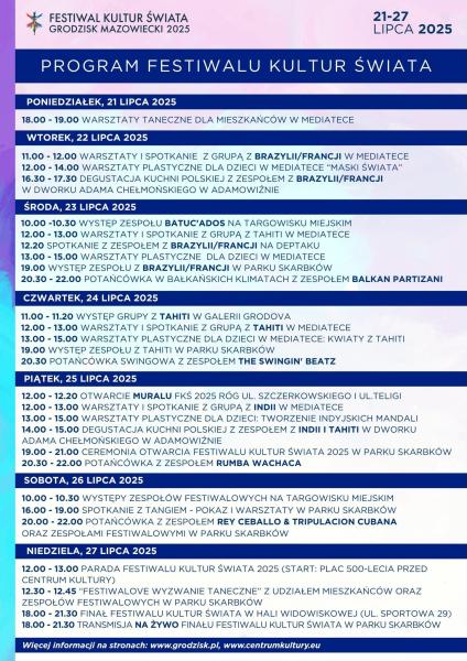 23–25 lipca (śr.–pt.), godz. 19:00 – koncerty plenerowe zespołów z Indii, Tahiti, Kostaryki, Francji/Brazylii i Polski na scenie w Parku Skarbków w Grodzisku Mazowieckim.